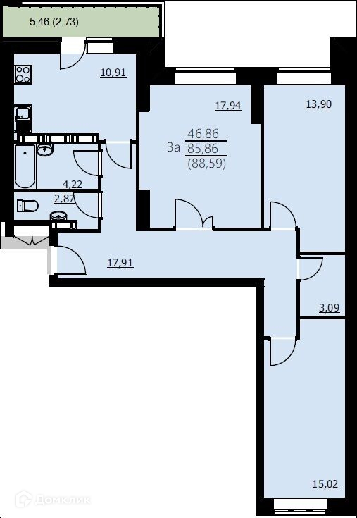 Планировка 3 комн. в ЖК Алые паруса