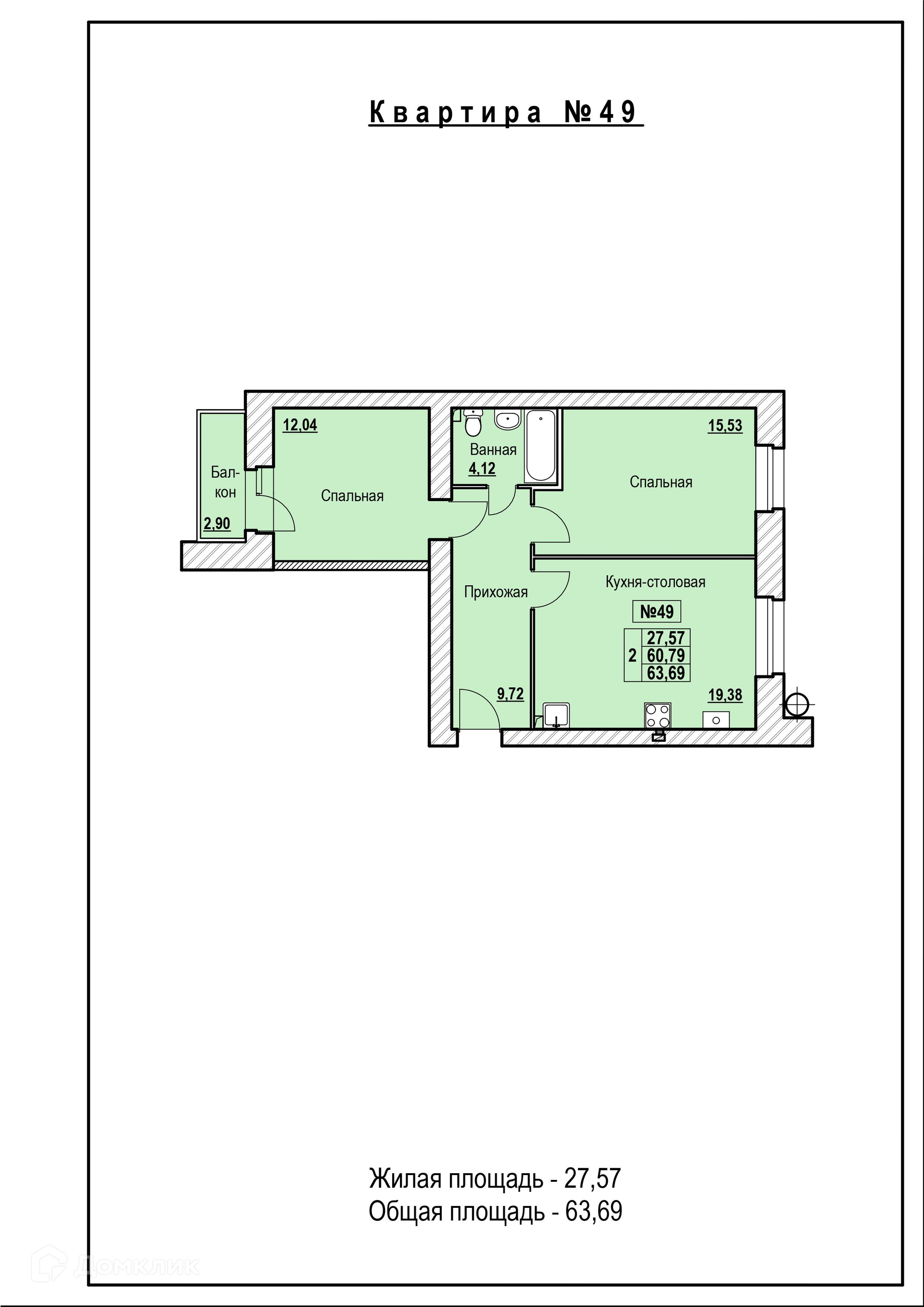 Планировка 2 комн. в ЖК в городе Ярославль, шоссе Тутаевское, д. 93-а