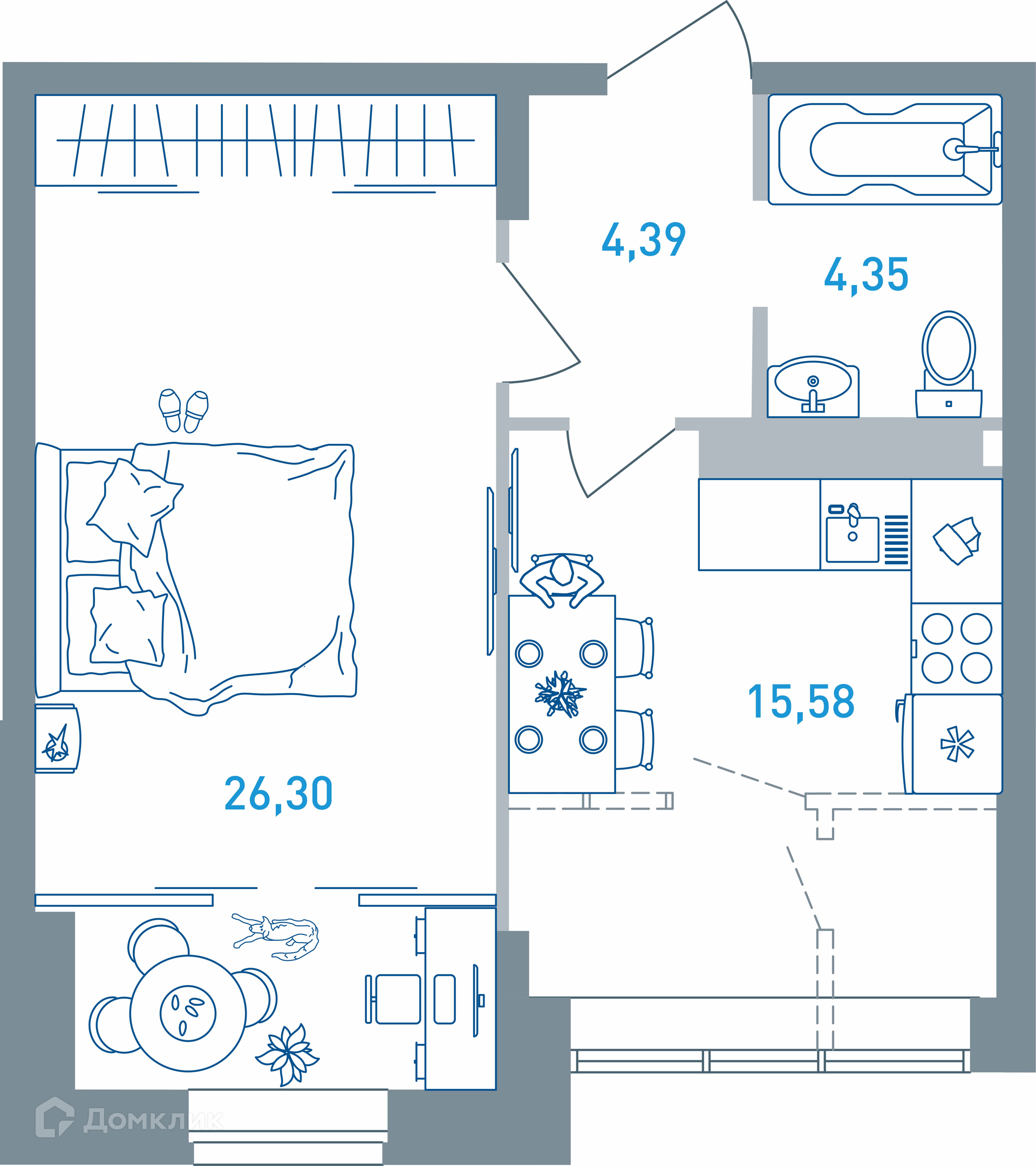 - Жилая площадь: 26.3 м²