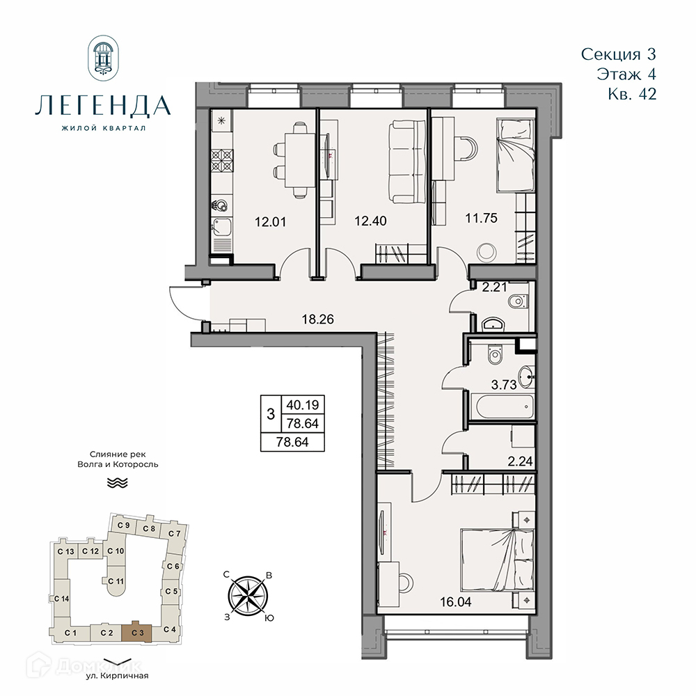 - ✅ Кухня: 12.01 м² — эргономичное пространство.