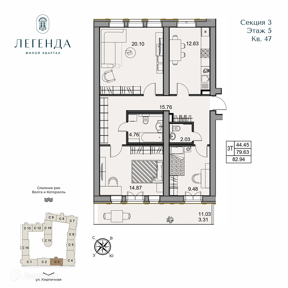 - ✅ Кухня: 12.63 м² — эргономичное пространство.