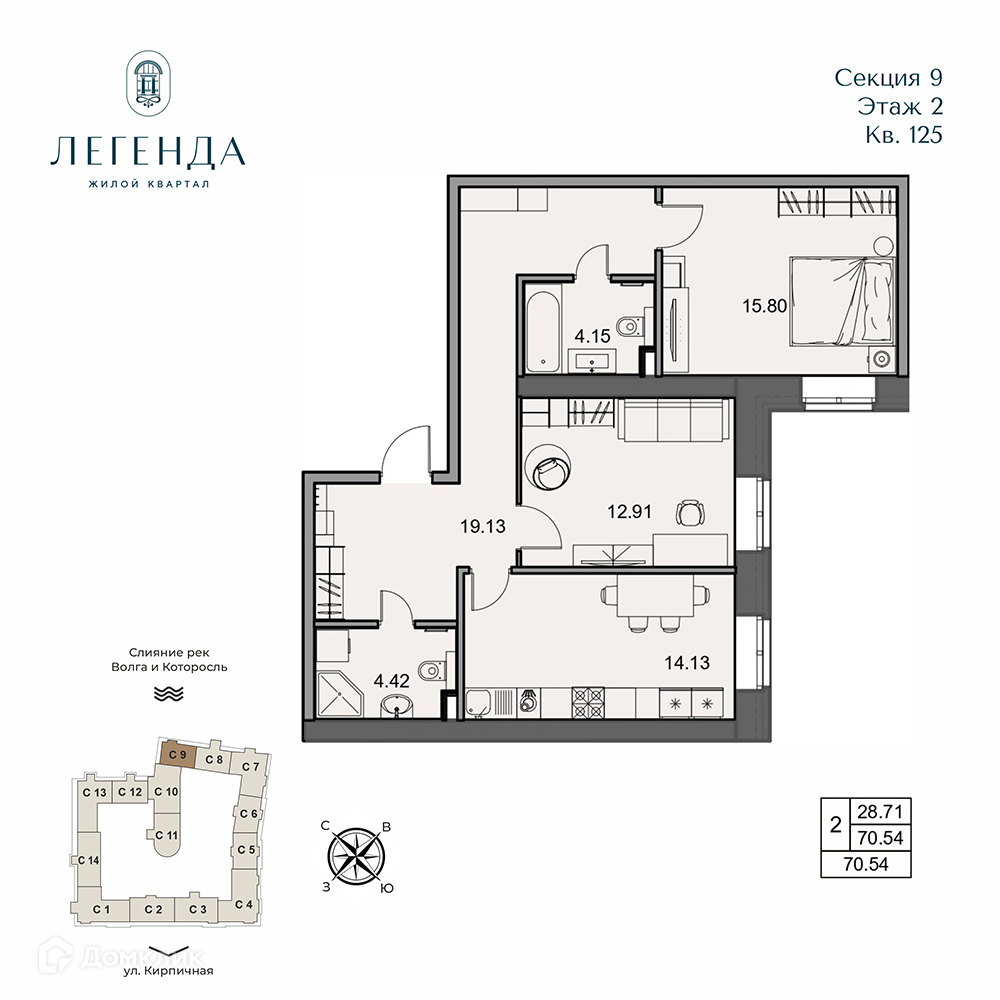 - ✅ Светлая жилая площадь: 28.71 м².
