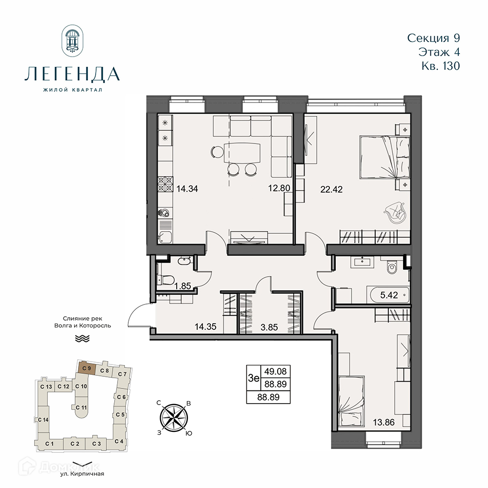 - ✅ Кухня: 14.34 м² — эргономичное пространство.