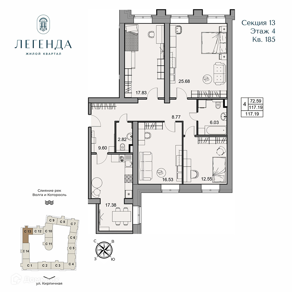 - ✅ Кухня: 17.38 м² — эргономичное пространство.